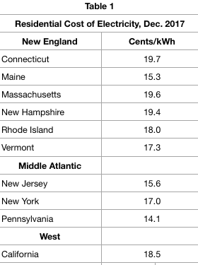 • States listed in table 1, with policies favoring wind and solar, have high electricity costs.