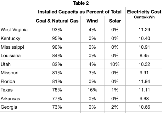• States listed in table 2, that rely predominantly on coal and natural gas, with little or no installed wind and solar, have the lowest electricity costs.