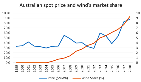 This outcome was due to political intervention in different aspects of supply, including banning gas exploration and raising coal royalties. But above all else, to the adoption of carbon-abatement measures. Those measures briefly included a carbon tax, but their fundamental drivers were increased obligations upon retailers for increasing levels of wind and solar energy under a Renewable Energy Target (RET) for “large scale” mainly wind facilities, and through direct subsidies.