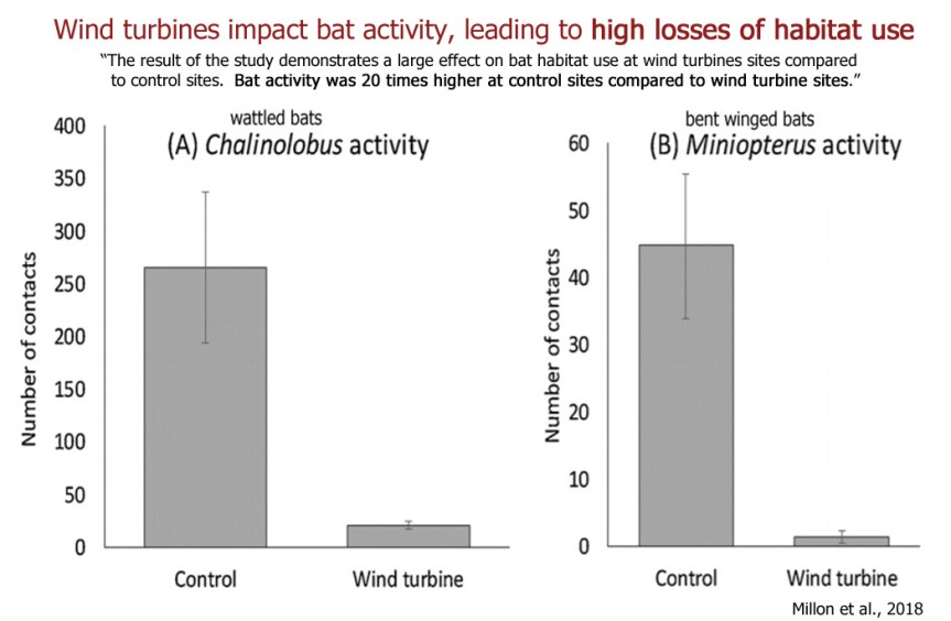 “Wind turbines impact bat activity, leading to high losses of habitat use … Island bats represent 60% of bat species worldwide and the highest proportion of terrestrial mammals on isolated islands, including numerous endemic and threatened species (Fleming and Racey, 2009). … We present one of the first studies to quantify the indirect impact of wind farms on insectivorous bats in tropical hotspots of biodiversity. Bat activity [New Caledonia, Pacific Islands, which hosts nine species of bat] was compared between wind farm sites and control sites, via ultrasound recordings at stationary points [A bat pass is defined as a single or several echolocation calls during a five second interval.] The activity of bent winged bats (Miniopterus sp.) and wattled bats (Chalinolobus sp.) were both significantly lower at wind turbine sites. The result of the study demonstrates a large effect on bat habitat use at wind turbines sites compared to control sites. Bat activity was 20 times higher at control sites compared to wind turbine sites, which suggests that habitat loss is an important impact to consider in wind farm planning. … Here, we provide evidence showing that two genera of insectivorous bat species are also threatened by wind farms. … To our knowledge, this is one of the first studies quantifying the indirect negative impact of wind turbines on bat activity in the tropics. … The lower attractiveness of the foraging habitat under wind turbines, both in a tropical and in a temperate climate, indicates that the indirect impact of wind turbine is a worldwide phenomenon.”