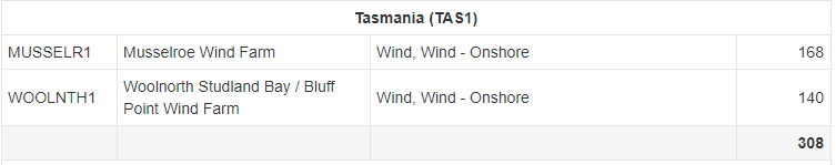 Tasmania has two major wind farms, Musselroe (on the north-east tip) and Woolnorth (on the north-west tip), with a combined capacity of 308 MW.