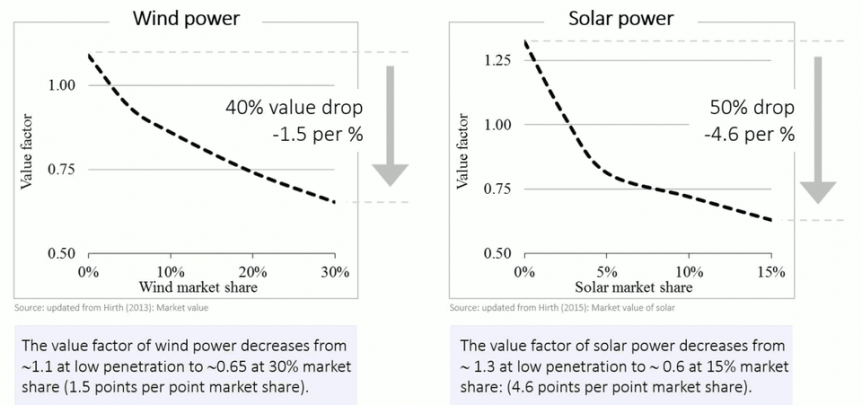 In a paper for Energy Policy, Leon Hirth estimated that the economic value of wind and solar would decline significantly as they become a larger part of electricity supply.