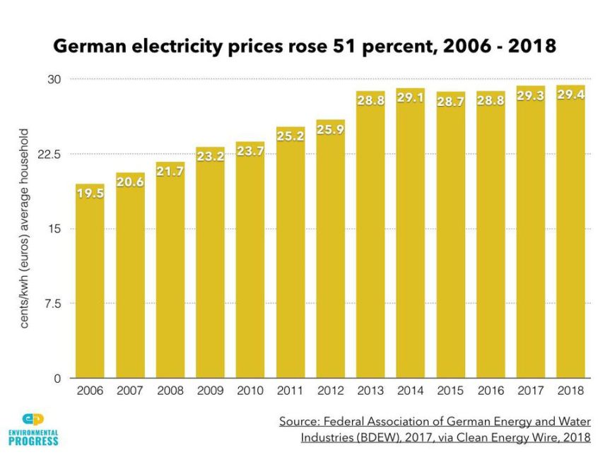And yet — during the same period — the price of electricity in places that deployed significant quantities of renewables increased dramatically.
