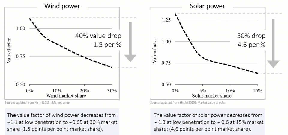 In a paper for Energy Policy, Leon Hirth estimated that the economic value of wind and solar would decline significantly as they become a larger part of electricity supply.
