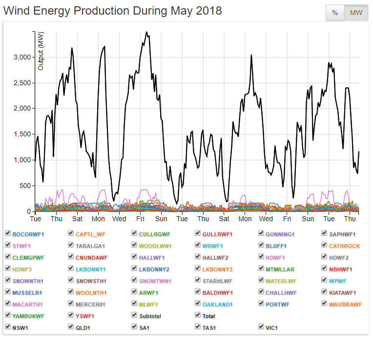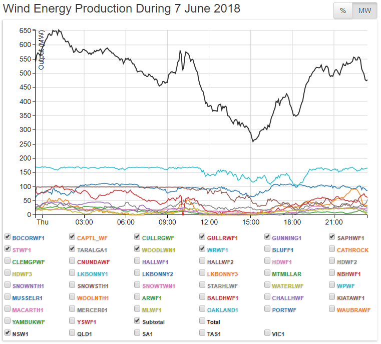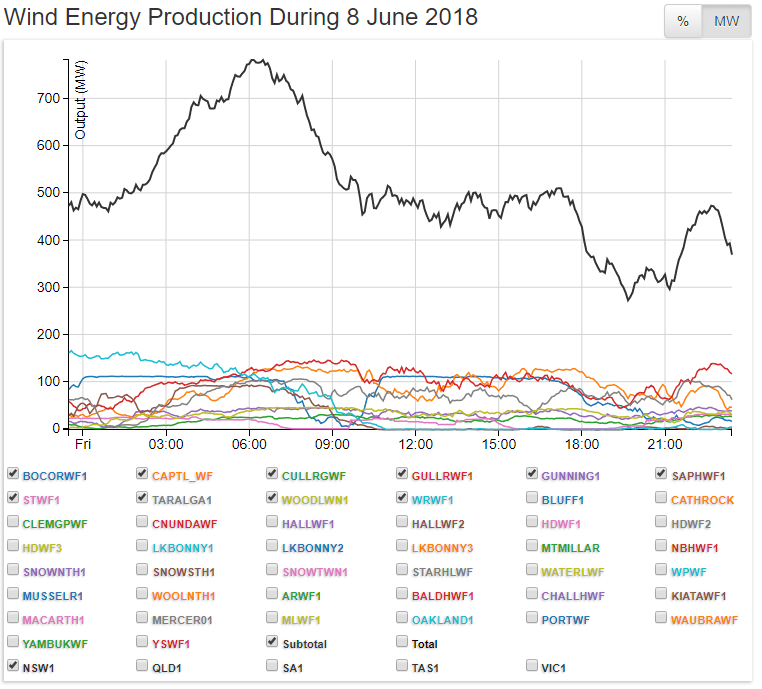 The right side of the AEMO graphic above depicts the spot price for power on 8 June when, at 5:30 PM the spot price hit $14,000 per MWh. Between 9am and 5pm total wind power output was around 450 MW (but never more than 500 MW) (or between 34% and 38% of notional capacity).