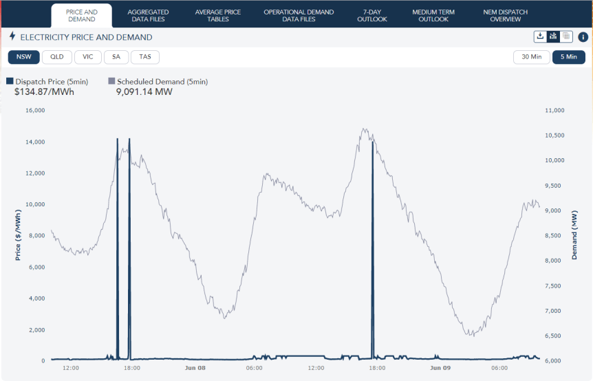 On 7 June, at 5:30 PM and again at 6:30 PM, the spot price (depicted in dark blue) topped out at the regulated market cap of $14,200 per MWh – as the day wore on and demand rose (depicted as the feint grey line in the AEMO graphic).