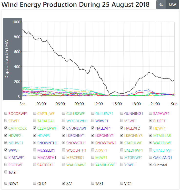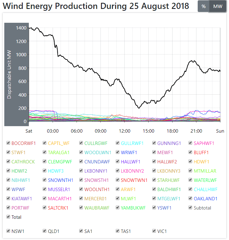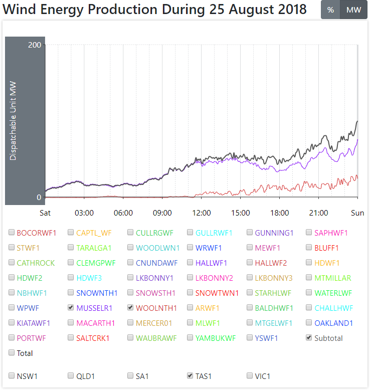 The effort from the Apple Isle, Tasmania was never more than 80 MW and less than half that for the best part of the day: