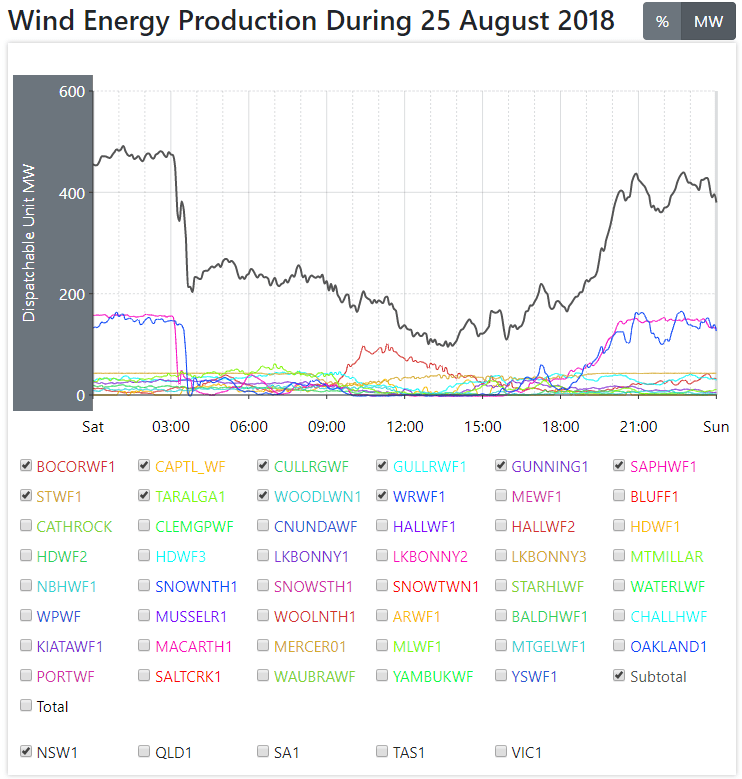 Queensland’s wind power capacity is a trivial 180 MW and managed to muster up no more than 20MW that day, so we’ll take a look at NSW where – during the critical period – output was less than 100 MW, having dropped from around 270 MW over the morning: