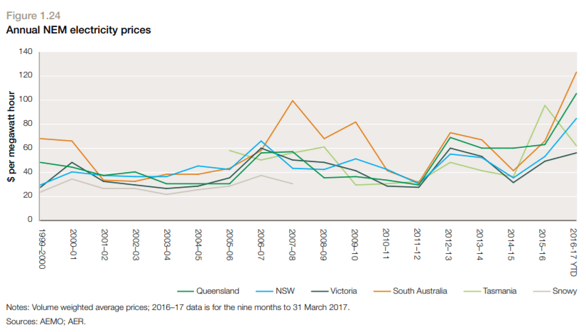South Australia continued to experience several bouts of market volatility and extreme prices in 2016–17. In the nine months to 31 March 2017, its weekly prices averaged $128 per MWh, which was an unprecedented level for the NEM (table 1.7). South Australia also experienced security issues over the period, including load shedding and blackouts.