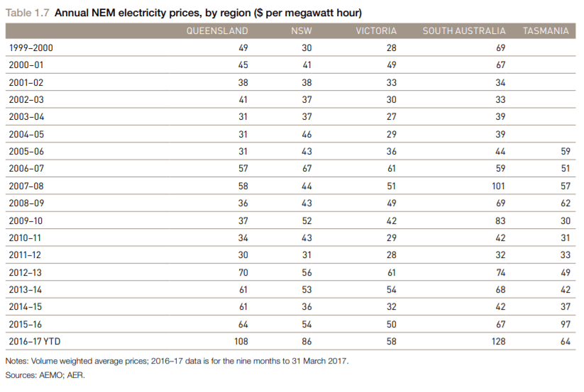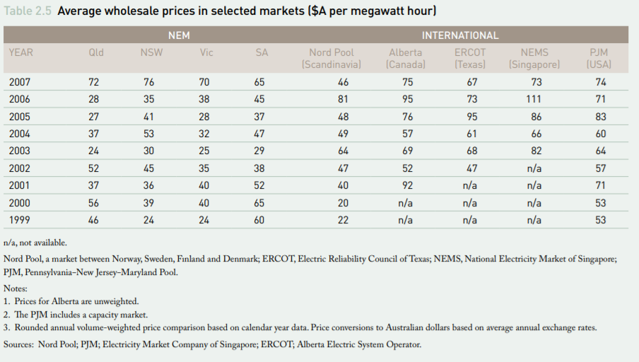 Another line from Simon Holmes a Court’s Wonder World is not only that SA’s wholesale power prices have always been historically high, they’ve been higher than the other Australian states and, therefore, presumably higher than comparable countries, around the world. The AER data suggests otherwise – this from the same report: