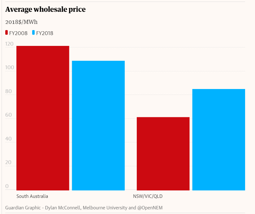 But, if the starting point is after May 2016 – when Alinta closed its coal-fired Northern power station and SA lost 546 MW of reliable, baseload power – up to 2016-17 the average is $97.50, close to double the rates that prevailed between 1998-99 and 2006-07, but still less than the current figure of $110 quoted by Holmes a Court in his epistle to The Guardian.