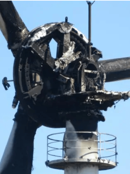 Wind turbine fires are ten times more common than the wind industry and its parasites claim (see our post here and check out this website: http://turbinesonfire.org).