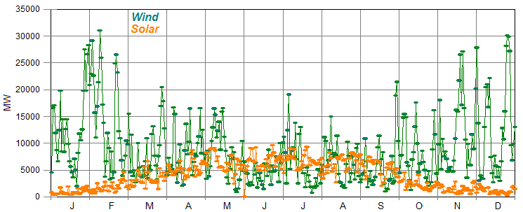 Figure 1 shows shows Germany’s actual wind and solar generation in 2016. Wind generation, which is highly erratic, peaks in the winter while solar generation, which is far smoother (at least when presented as daily averages) peaks in the summer: