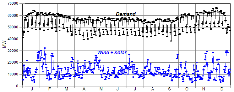 Figure 2 compares combined wind + solar generation during 2016 with demand. Adding solar to wind tends to flatten out annual generation but does not make it an ideal match to demand: