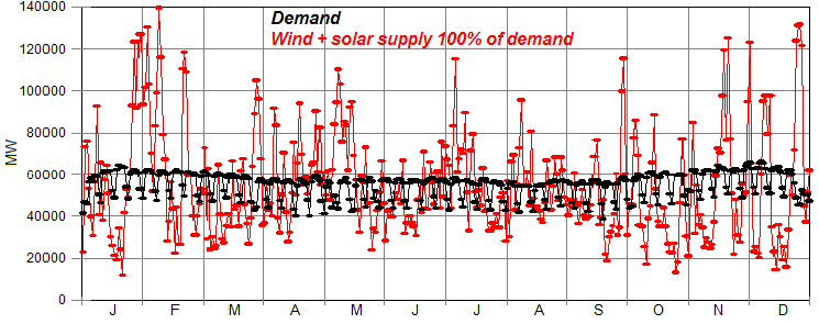 Figure 3 compares 2016 demand with combined wind + solar when wind + solar is factored up so that it generates 100% of total annual demand. Generation broadly follows demand during the year but the erratic wind generation creates periodic surpluses of up to 80,000 MW and deficits of up to 50,000 MW: