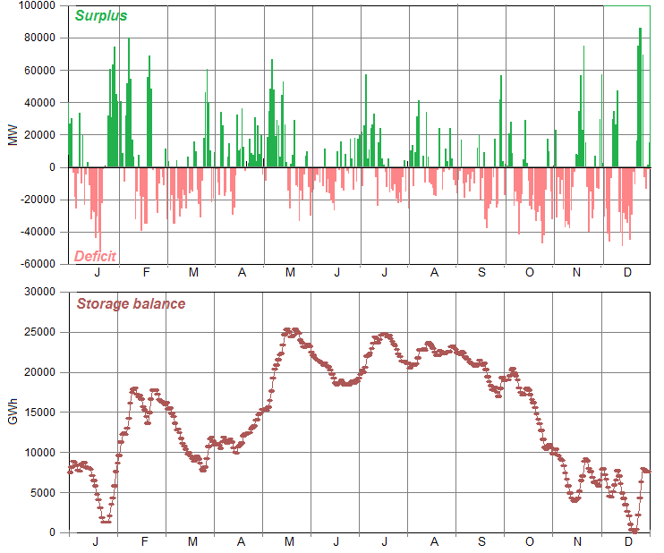 Here we see a seasonal pattern, with surplus energy generated from wind in the winter and spring having to be stored in the summer for re-use in the coming winter, and with storage capacity reaching a maximum of slightly over 25,000 GWh (25 TWh) in May.