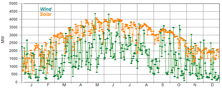 Figure 5 shows California’s actual wind and solar generation during 2017. Wind and solar generation both peak in the summer: