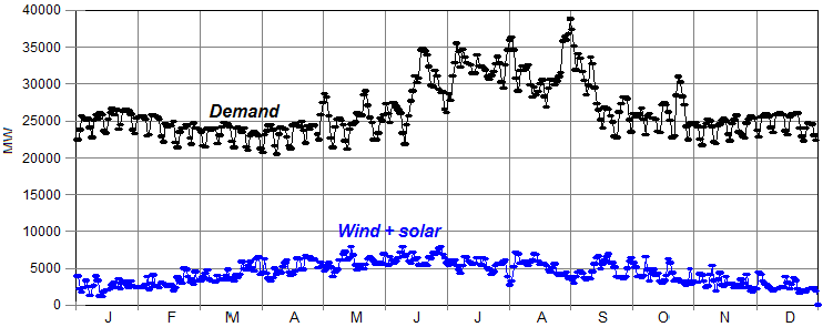 Figure 6 compares the sum of wind & solar against demand. Summing the two results in a pattern that broadly matches the summer peak in demand but not the “air-conditioning” peaks in June, July and August: