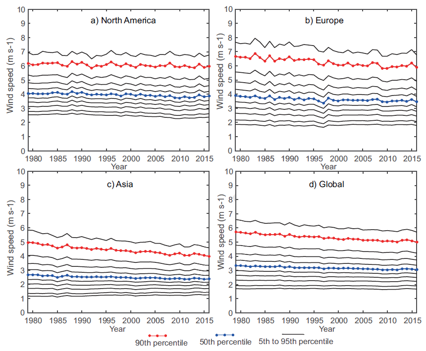 Consistent with the decrease of surface wind speeds, the wind power potential was also decreasing in most regions of the Northern Hemisphere in the past decades. Around one third of the stations in North America, have experienced a huge decrease (over 30 percent) in wind power potential while over half of the stations in Europe and around four-fifths in Asia have the same magnitude of decrease.