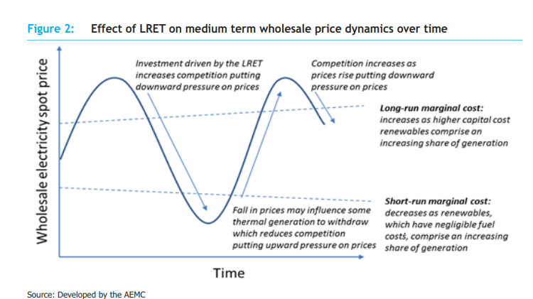 The overall impact of the LRET has therefore been to drive down wholesale prices in the short term but, in the absence of policies and incentives to encourage investment in replacement generation and firming technologies, it contributes to periods of more volatile and potentially higher wholesale prices. (page 44).