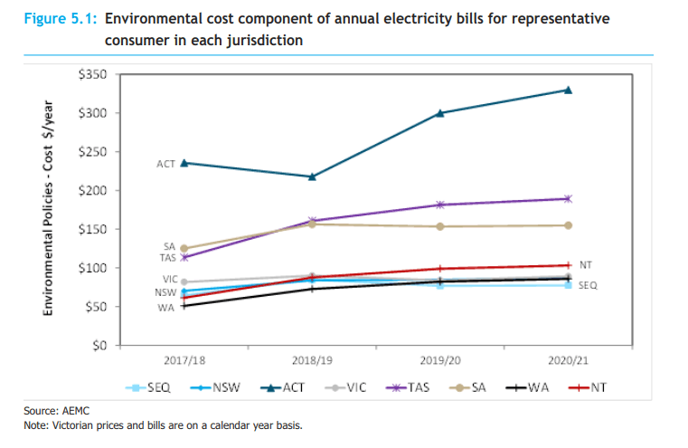 Environmental policy costs directly account for 3 to 14 per cent of a representative customer’s annual bill, depending on the jurisdiction in 2017-18. Environmental policy costs are increasing in most jurisdictions over the reporting period, primarily due to the continued growth in solar penetration and the consequent increase in costs for the Small Scale Renewable Energy Scheme (SRES). (Summary, paragraph 14-15)