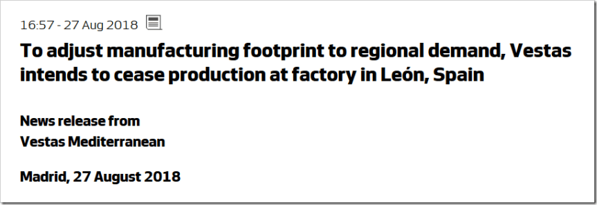 Responding to these market developments and to sustain its competitiveness, Vestas intends to cease production at its assembly factory in León, Spain, affecting all of the factory’s 362 employees. The employees have been informed about the intention to cease production through the local works council and will also receive a letter from Vestas with information on the situation and contact details for further information.
