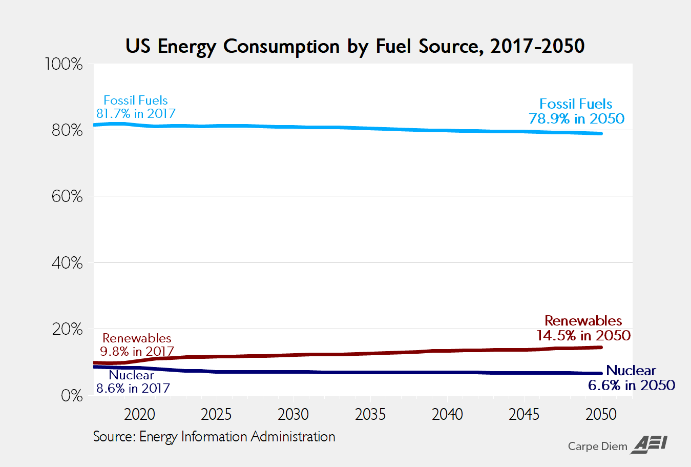 MP: The chart above shows the latest EIA forecast to 2050, and confirms Richard’s forecast that the “dominant source of energy for the foreseeable future for both the United States and the world will be fossil fuels, chiefly in the form of oil, natural gas, and coal.” In fact, maybe not just the foreseeable future, but the future for the next quarter-century or more! Even more than 30 years from now, the fuels of the future — coal, natural gas, and oil — will be the sources for about 79% of our energy demand, not much different than today. And despite all of the hype and taxpayer subsidies, solar panels and windmills will supply less than 15% of our energy in 2050.
