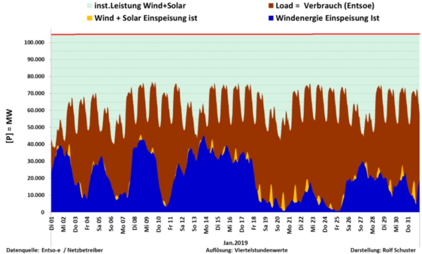 The upper horizontal line represents total installed sun and wind capacity = 105,000 MW. Yet, for example on January 25, There was a night where almost nothing got fed in by wind and sun. Not once was the 105,000 MW of installed capacity able to even come close to supplying Germany’s peak power demands of 75,000 MW.