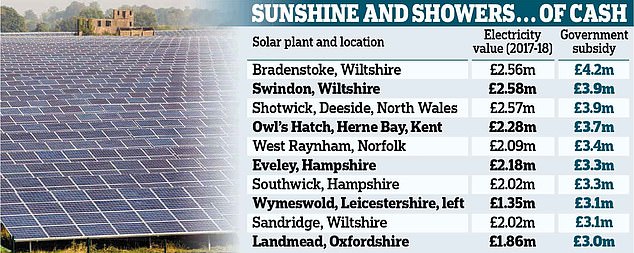 - Ten of UK’s biggest solar farms pocketed £3million plus in eco subsidies last year