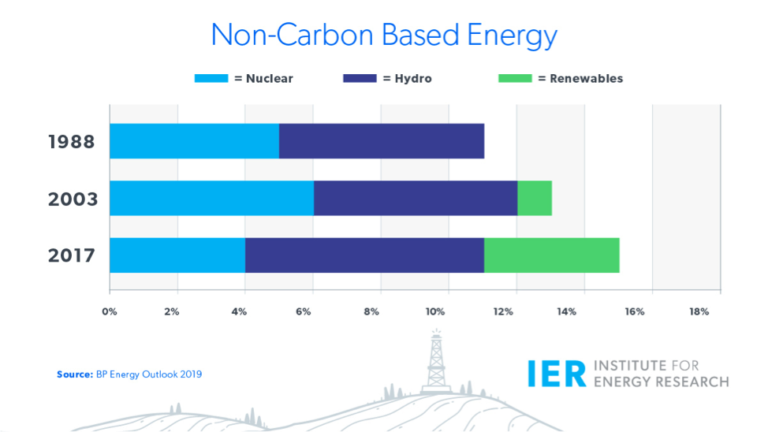 The second chart shows the composition of non-carbon-based energies (renewables and nuclear power), accounting for 11 percent in 1988. With the growth of non-hydroelectric renewables (primarily wind and solar power), this share grew to 15 percent in the most recent year.