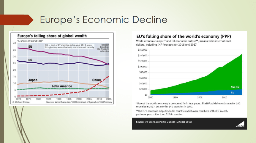 The 21st century will see a relegation of Europe, not to the third world but to the second world. The biggest economies in the next 30 years will be China, India, and the US, in that sequence. China has overtaken the US. India will overtake the US in the next 10 to 20 years. We will see a completely different map of the world economically, politically, and Europe doesn’t seem to want to play ball anymore.