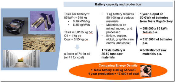 I am not even considering the overburden that needs to be moved for each ton of minerals mined. The overburden ratio can be estimated 1:10. Thus, you can 10x fold the numbers above. One Tesla battery requires 500-1.000 tons of materials to be moved/mined compared to coal which requires only 0,3 tons – a factor of 1.700 to 3.300!