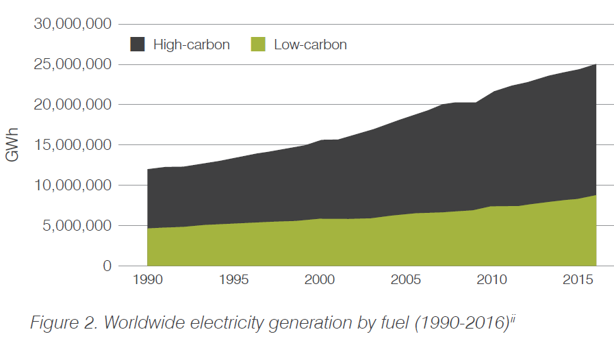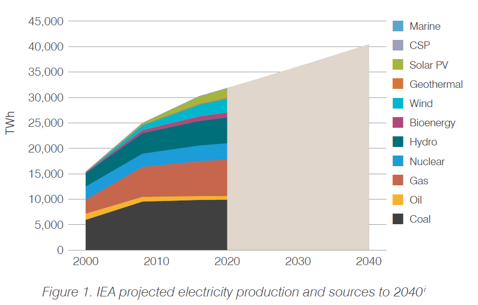 i International Energy Agency (2018), World Energy Outlook 2018. Data accessed from https://www.iea.org/weo/ – Based on the New Policies Scenario, which incorporates existing energy policies as well as an assessment of the results likely to stem from the implementation of announced policy intentions – with visual modification by World Nuclear Association.