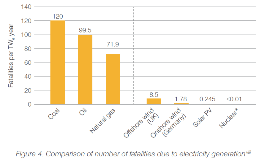 In regard to the need for a holistic safety paradigm for the whole electricity system, we need to consider safety from a societal perspective, something the current energy system fails to do. The health, environmental and safety benefits of nuclear energy are not sufficiently understood and valued when compared with other electricity sources. Nuclear energy remains the safest form of electricity generation (Figure 4). Additionally, the use of nuclear consistently prevents many tens of thousands of deaths (mainly resulting from air pollution) every year by avoiding the use of coal – lifesaving measures which must be better recognised and valued.