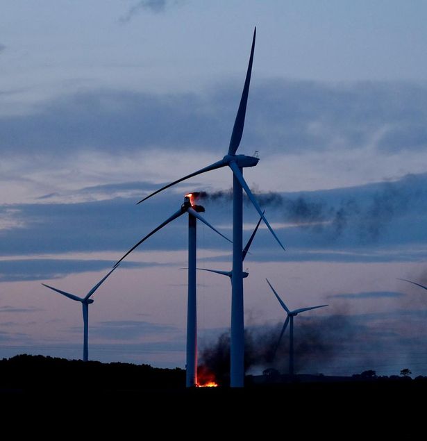 Wind turbine blaze sparks more than 90 calls to fire service as flames rise from propellers