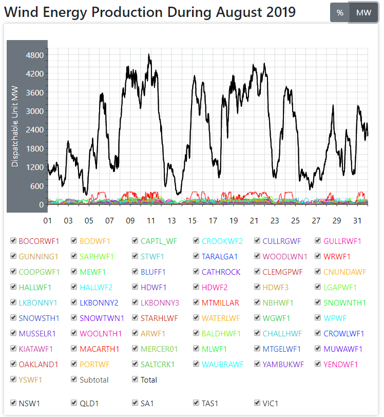 Currently there’s 6,702 MW of total capacity situated in Tasmania, South Australia, Victoria, NSW and Queensland and spread from Hornsdale in the Mid-North, west to Cathedral Rocks on lower Eyre Peninsula and south to Millicent in the South-East of South Australia; down to Cape Portland (Musselroe) and Woolnorth (Cape Grim) in Tasmania; all over Victoria; at Broken Hill in the far west of NSW, and right up to Glen Innes in the New England Ranges of NSW and at Mount Emerald on the Atherton Tablelands in Queensland.