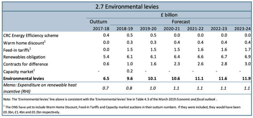 Apart from the Contracts for Difference (CfD), there are two other systems of subsidy, the Renewables Obligation (RO), including the Feed-in Tariff (FiT). The costs of these are recorded in the Office for Budget Responsibility’s Economic and Fiscal Outlook, the most recent issue of which was published March 2019 (a new release is due shortly). reports the current and projected costs of these subsidies amongst other Environmental Levies, a screenshot of which is reproduced below: