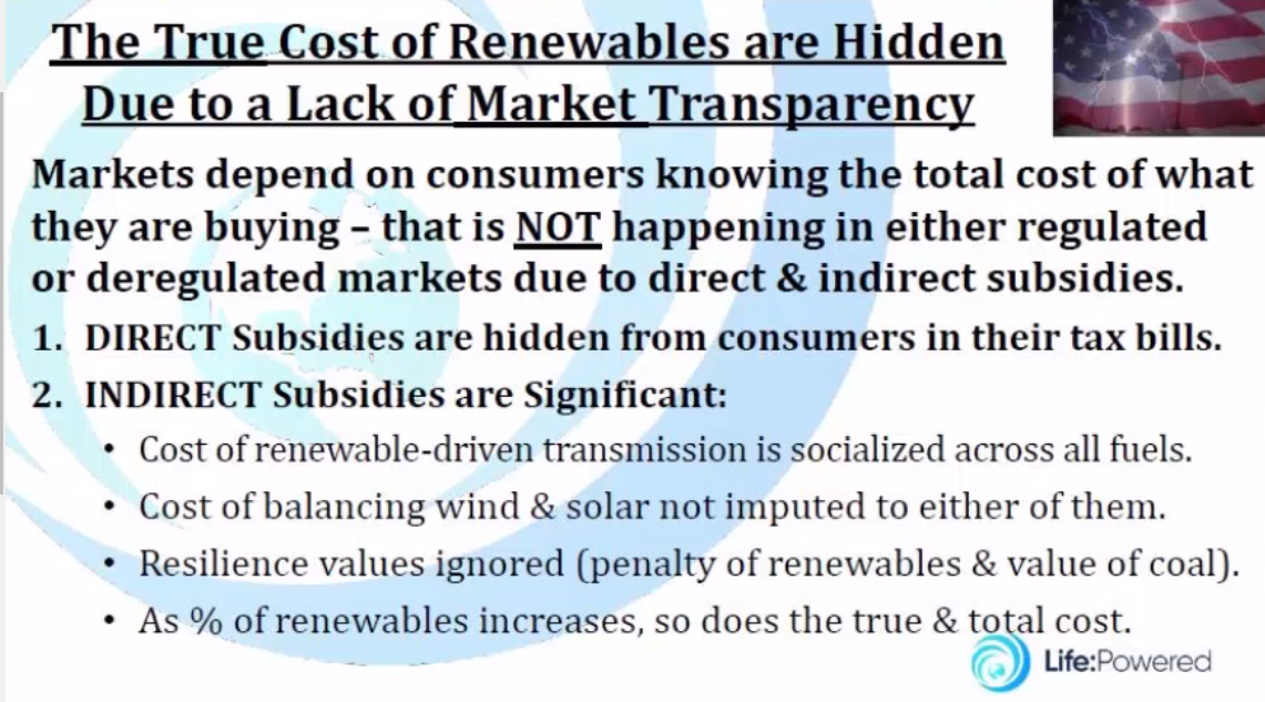 I hear people say all the time, Oh, all fuels are subsidised. Well, Life:Powered, which you heard from dr Brent Bennett two weeks ago who I work with in Austin has done detailed analysis of what the return on investment of subsidisation is because it is true that all energy is subsidised. The question is what’s the return on investment? And I think the results of those studies show time and time again that the ROI on fossil R&D is certainly significantly lower than what we have on renewables. I’m not going to do a deep dive today on that. I’m going to leave it alone because I think the less understood area is the indirect subsidisation of renewable energy. Okay?
