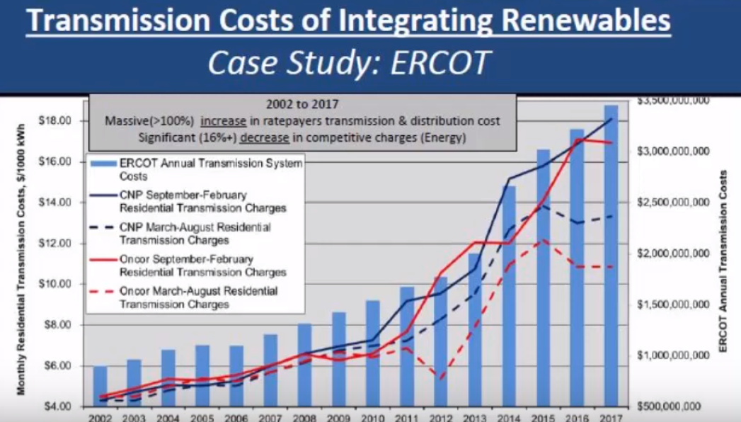 So this is a busy slide and we’re not going to go through it all, but it is a great example. I’m from Texas, and so when you move there, I’m not native, so I guess I just am a little bit more free to do this. I’m willing to criticise my own state, maybe more than a native Texan. The reality is that the ERCOT market in particular and the experience that we have had in renewable penetration is so often cited in a surficial level as a huge success story. And there’s many things that are successful about Texas and the grid, but the story of wind penetration in particular is a cautionary tale, one that every state should be watching. What this very busy slide shows you is that the cumulative transmission build has literally doubled the distribution and transmission component of a rate payer in Texas. Okay? We spent $9 billion on a renewable build called the Competitive Renewable Energy Zone, CREZ Bill, to date. And then studies are showing that if we continue down this path of deeper renewable penetration, we’ll spend another 14 billion.