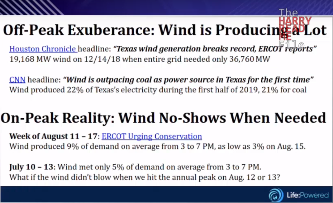 So off-peak exuberance versus on-peak reality, a very important issue. Okay? I mean a classic example are the headlines you hear. If you were just reading national news about Texas, you would think, Oh my gosh, it’s incredible. And it is an amazing story that we have penetrated the Texas market so much with wind that there are times of the year where we are… and if you annualised over the whole year, we have a lot of wind production, even more than coal in the first half of the year. However, I think everyone here knows this, the system is not built on annualised percentages. It’s built on peak needs. We have to have a system that can sustain itself at peak demand and at peak exposure to natural elements. And the story in Texas is an incredibly cautionary one. And these graphs are scary if you’re utility person, but everybody needs to understand the weight of what we’re talking about.