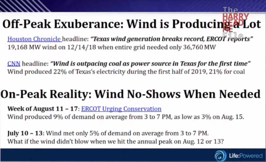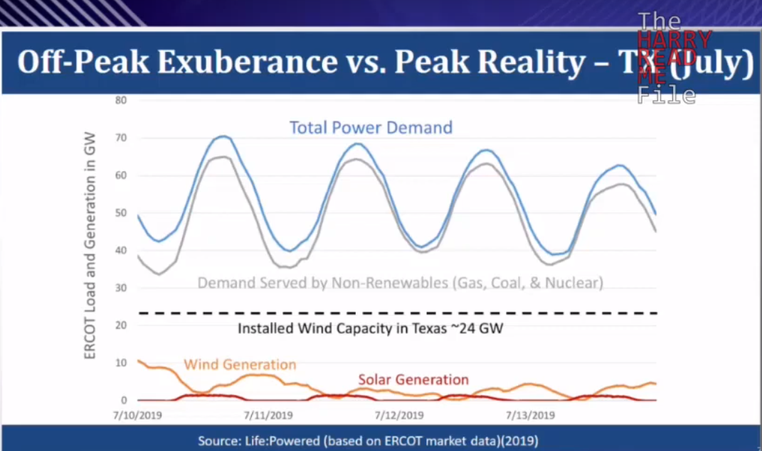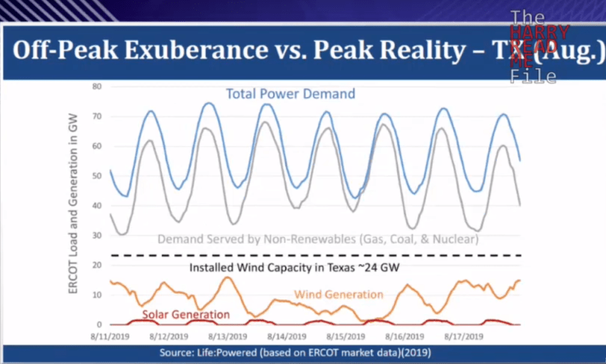This is busy, but you basically can see the blue line is the power that the market needed and it cycles like everybody has seen in other charts depending on the time of day. This is a summer scenario, right? The orange line is the wind generation, the dotted line across is how much wind capacity we have. It’s a massive wind fleet, 24 gigawatts. Okay? 24,000 megawatts. The average production when we need it most is just significantly lower, in the single digits of percentage. And as Dr. Bennett addressed when he talked about battery storage two weeks ago, the gap between wind and solar at peak and what we need is a battery capacity infiltration that frankly can’t exist based on current physics and economics. It is a far too simplified story that people keep on thinking that we can battery storage or even energy storage our way out of that problem. And by the way, this was not an isolated circumstance.