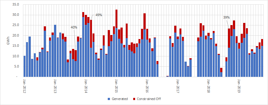The volume of energy lost through constraints is in total significant, and in some periods can be very substantial as the following chart shows. In March 2014 a striking 49% of output was constrained off at a cost to the consumer of more than a million pounds. The annual constraints for Gordonbush peaked at 22% of potential output in 2015, and have been at 15–16% for the last two years.