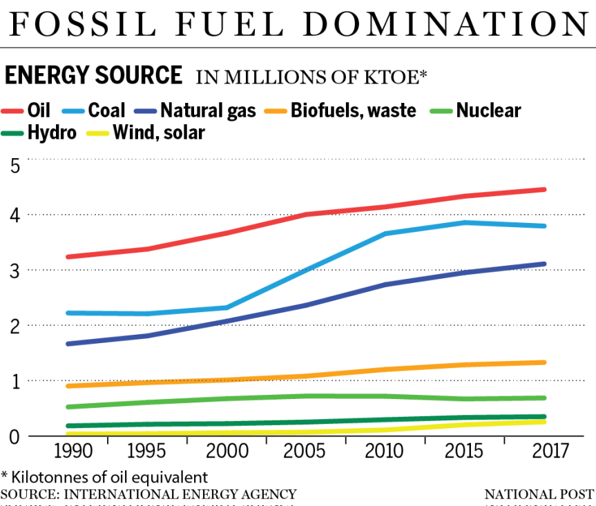 According to the International Energy Agency, nearly all the growth in global energy consumption over the period is accounted for by growth in fossil fuels. Renewable energy in total, including traditional biomass in the developing world, made up 13 per cent of total primary energy in 1990 and 14 per cent in 2017. Renewables have grown by 72 per cent over that period, from a low base, but fossil fuels have grown by 59 per cent from a substantial base, and consequently, they continue to dominate world energy.