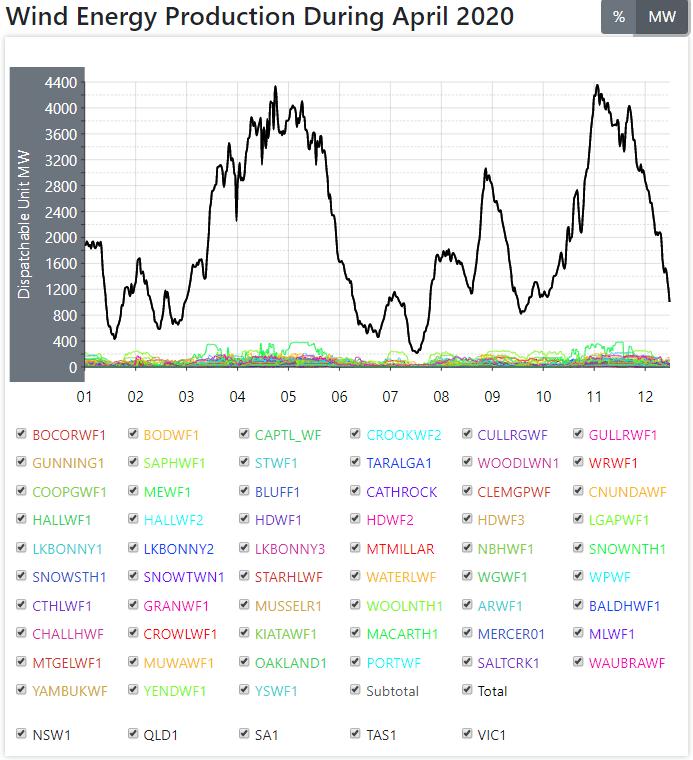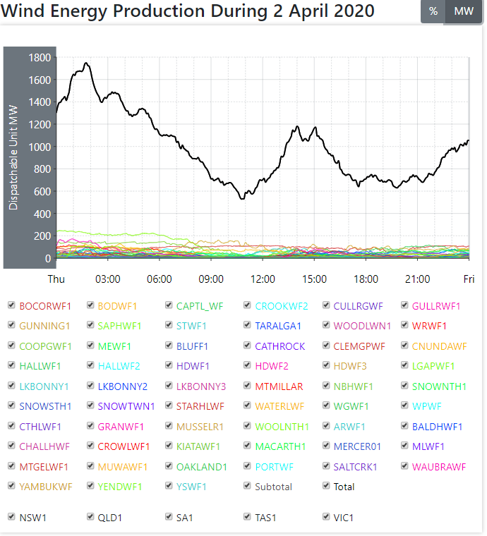 Depicted above – courtesy of Aneroid Energy – is the output delivered by Australian wind power outfits to the Eastern Grid, so far this month.