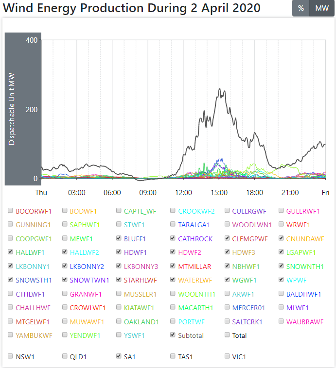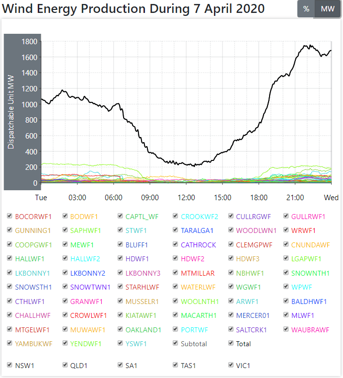 Drilling down on what’s depicted above, below is the output on 7 April 2020, when the entire fleet was producing a trivial 206 MW, or 2.95% of total capacity around Noon that day: