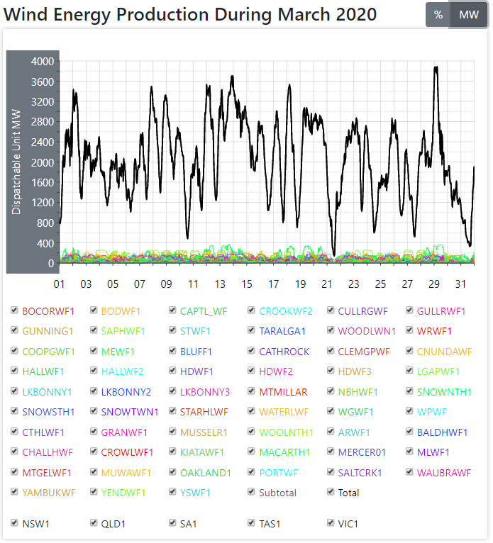 In contrast to the RE numbers, the delivery from nuclear and hydrocarbon sources can probably approach 100% although the pricing system and the mandates for RE keep the delivery from coal well below capacity in most parts of the western world at present. (Australian black coal has gone as low as 8.1GW and as high as 16.1 GW and it is mostly between 9.5 and 12.5). If you reduce the 64 to 90% you get 57GW that is well ahead of the 40 from the sun and wind.