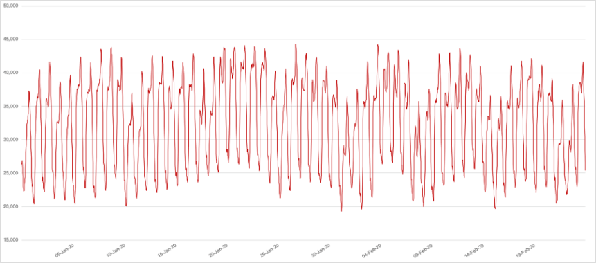 Figure 2. National Demand (the sum of metered generation excluding generation required to meet station load, hydro storage pumping and interconnector exports) by half-hourly settlement period from the 1st of January to 24th February (MW). Source: Chart by the author: National Grid data.
