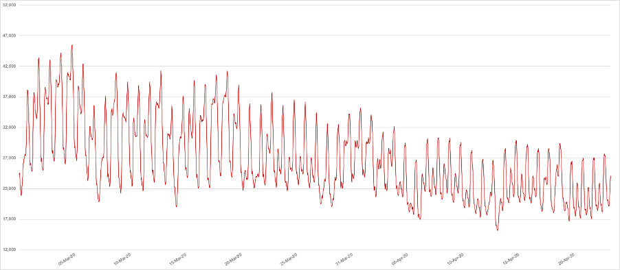Figure 3. National Demand (the sum of metered generation excluding generation required to meet station load, hydro storage pumping and interconnector exports) by half-hourly settlement period from the 1st of March to 23rd April (MW). Source: Chart by the author: National Grid data.