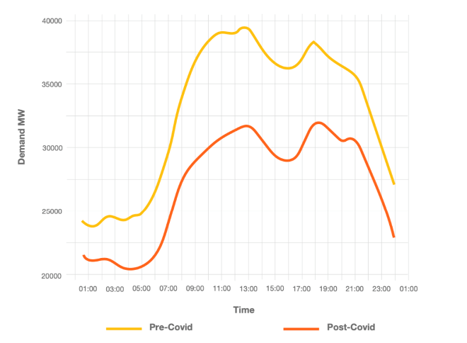 The largest demand fall in the chart appears to be in the order of 19%, and generally the currently observed reduction is, as NG comments, “between [the]‘medium impact’ and ‘high impact’ scenarios” considered in the Summer Outlook.