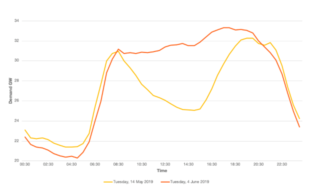 Figure 5: Impact of embedded solar generation on transmission system demand, Tuesday 4th June 2019 (red line, low solar infeed), and Tuesday 14th May 2019 (yellow line, high solar infeed). Source: NG ESO, Summer Outlook (2020), p. 11.